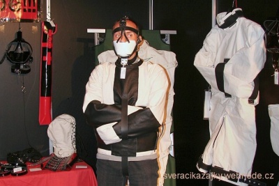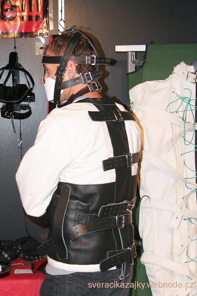 Další zajímavostí, kterou jsem objevil, bylo předvádění selfbondage ve svěrací kazajce. Tento návod jsem četl už dříve na jednom fóru, ale dnes jsem mohl celý postup vidět od samotného autora. Klasická kožená kazajka byla upravena tak, že hřbetech rukou byly přidány zipy. Takže při rozepnutých zipech byly ruce volné a měl tak možnost si celou kazajku pohodlně obléci a utáhnout řemeny. Následně si zapl zip na jedné ruce. Ruce prostrčil břišním pásem a volnou rukou spojil řemeny od rukou pomocí segufix zámku, který je možné otevřít jen přiložením k magnetu. Po spoutání rukou uzavřel zip na volné ruce zatlačením o hranu konstrukce stánku. Otevřít zip ale nebylo možné, protože jezdec „zalezl“ pod hranu kůže a tak zpětné vytlačení o hranu již není možné a zip na hřbetě ruky je taky rukou ivnitř neovladatelný. Kdyby to byla pravá selfbondage, tak by následovalo nějaké znepřístupnění magnetu. Uzavření v kazajce bylo téměř dokonalé a zcela splnilo svůj účel. Slovo téměř píšu proto, že při normálním použití je dotažení rukávů o něco těsnější. Zvažuji koupi a úpravu nějaké kazajky, ale není na všechno čas.